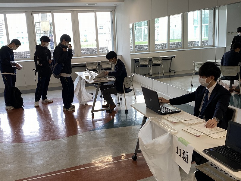 4月17日(土)に全学年対象の生徒健康診断を行いました。新型コロナウイルス対策の一環で、学年別、さらに学年を二手に分けて受付を行い、密を避けて実施しました。