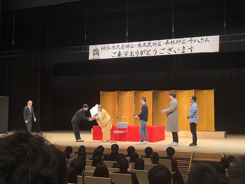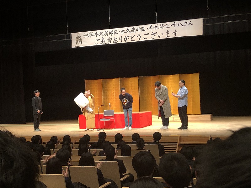 1月28日(水)『令和7年度芸術鑑賞』が行われ、カナモトホールで、古典芸能落語『初代林家木久扇 二代目林家木久蔵 父子鷹落語会』鑑賞会が行われました。2年前、55年続けられた人気番組『笑点』を卒業されたあともなお、元気に全国各地で活躍され、今年米寿をお迎えになった木久扇師匠。圧倒的な迫力で、前座のお弟子さんたちの掛け合いも楽しく、生徒たちは初めて生で見る落語に大笑いしながら、古典芸能のもつ力にしみじみと感じ入っていました。