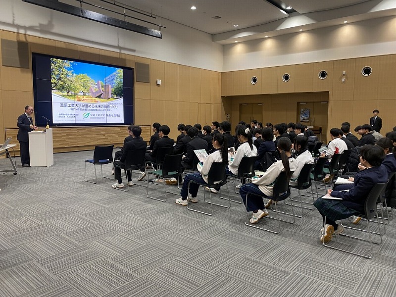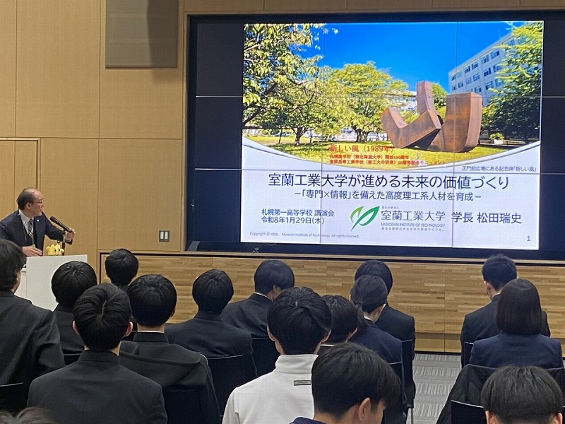 1月29日(木),本校大講義室において,室蘭工業大学の松田瑞史学長による講演会「室蘭工業大学が進める未来の価値づくり」が実施されました。松田学長は高校でのご講演はほとんど例がないそうで,たいへん貴重な機会となりました。