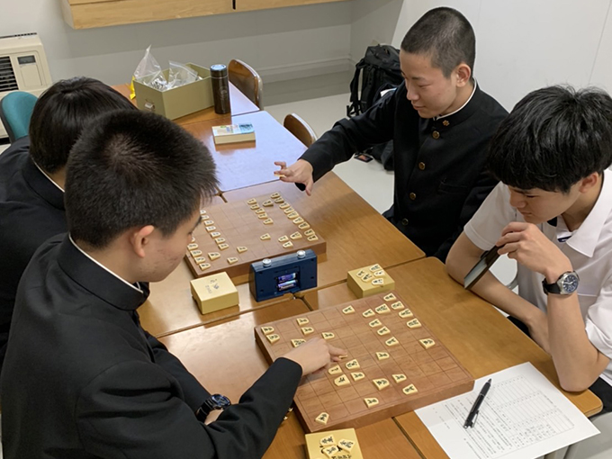 囲碁将棋同好会は3年生3人、2年生3人の計6人で毎週火曜日の放課後に対局や棋譜並べ、詰め将棋等の活動をしています。現在は全員将棋ですが、囲碁・将棋どちらも部員募集しています。駒の並べ方・動かし方が分からない人も大歓迎です。ぜひ見学に来てください。