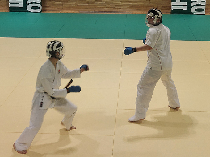 空手部では、放課後に週2回(水曜日・金曜日)、学校で練習を行っています。今年度は、組手の選手が3名在籍しており、練習では、組手に必要な基礎技術の習得や、実戦形式の試合を中心に取り組んでいます。また、選手たちは、各自が通う道場でも、練習を重ねています。空手部では、経験を問わず部員を募集しています。興味のある方は、気軽に見学にきてください!
