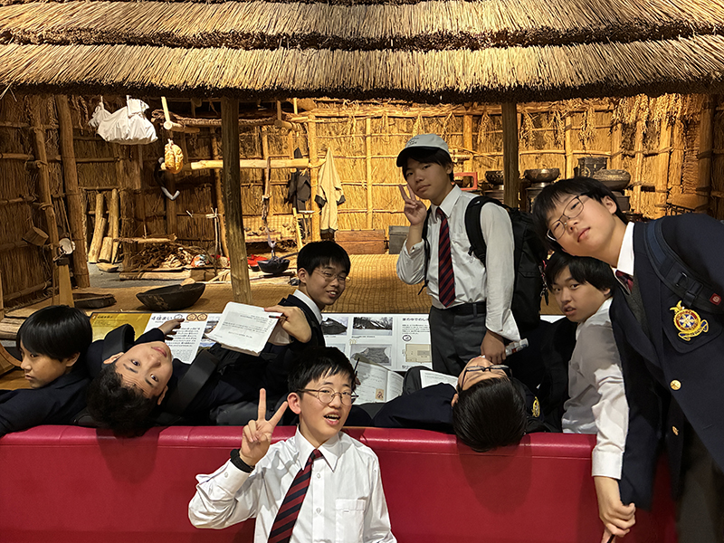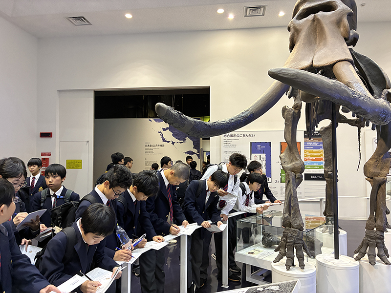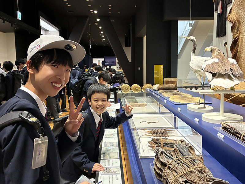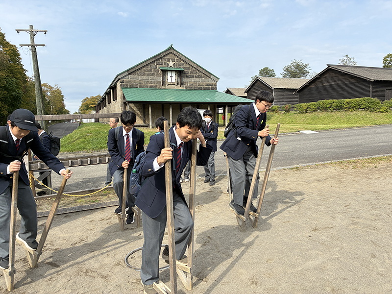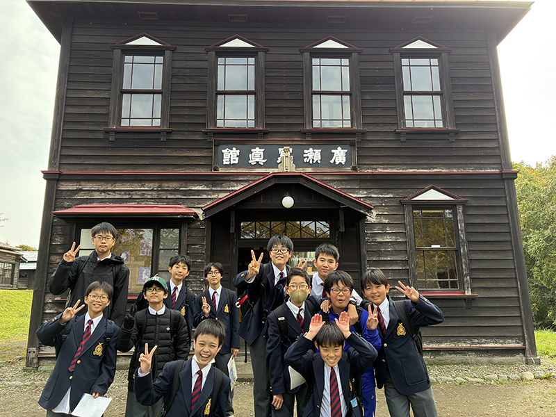 10月16日(木)、中学1年生がHOKKAIDOプロジェクトの一環として、北海道開拓の村と北海道博物館を訪れました。8月に実施された北海道知床探訪に続くこの活動は、生徒たちにとって大変貴重な学びの場となりました。午前中、生徒たちはまず北海道開拓の村を訪問しました。明治時代から昭和初期の時代にかけて建築された北海道の建造物を見ることで、当時の人たちの知恵や努力を間近に体感することができました。また、竹馬や独楽といった昔の遊びも体験し、北海道の歴史を学ぶひとときを過ごしました。午後は、北海道博物館に移動しました。「北東アジアのなかの北海道」、「自然と人とのかかわり」をコンセプトとされた展示をグループ単位で見学し、北海道の通史・自然、アイヌ文化等について学びました。また、生徒たちは学芸員の方の説明に対して真剣な表情で耳を傾け、大変有意義な時間を過ごすことができました。1日を通して、生徒たちは座学では学ぶことのできない多くのことを体験し、研修内容に対して真剣に取り組みました。生徒たち一人一人には、北嶺での数多くの行事を経験しながらこれからも大きく成長してほしいと願っています。