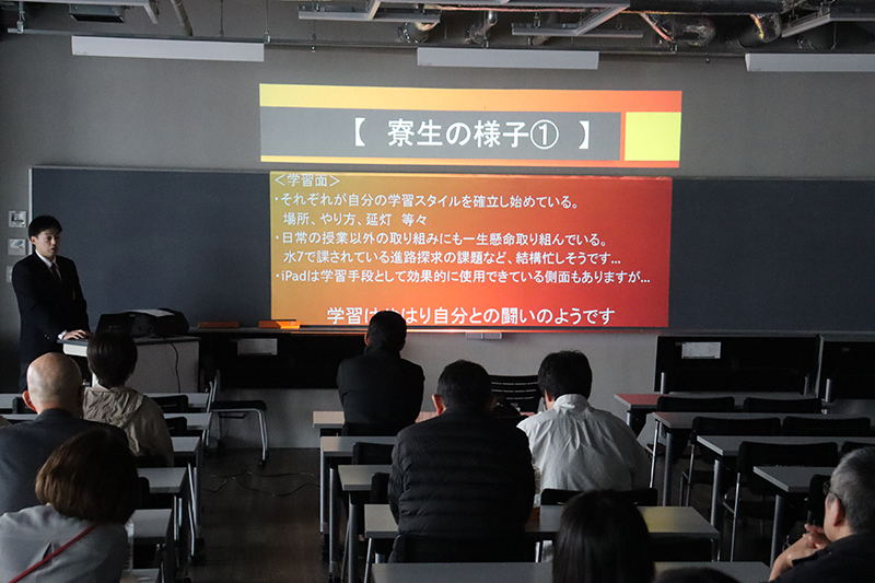 学年懇談会終了後には、青雲寮保護者全体会も開催しました。井口寮監長より寮の現状についてご報告を行い、たらんぼの会会長の藤澤様からは上半期の総括をいただきました。最後に、谷地田校長より寮生の保護者の皆様にご挨拶申し上げました。寮生の保護者の皆様には、昼食後、学年別懇談会にも引き続きご参加いただき、寮生の学習面や生活面についてお伝えする貴重な機会となりました。