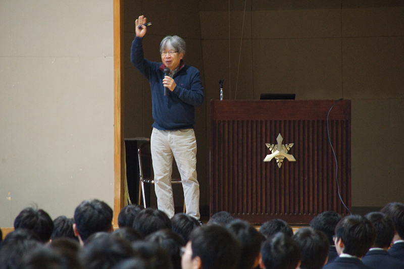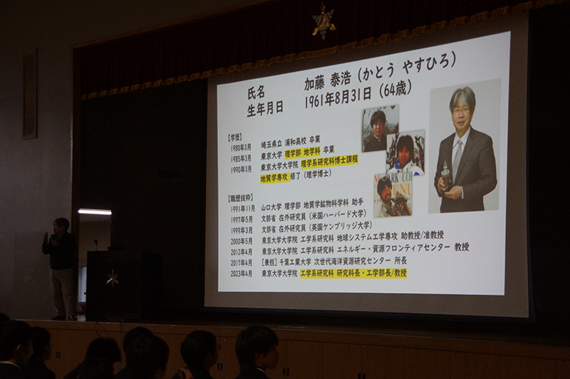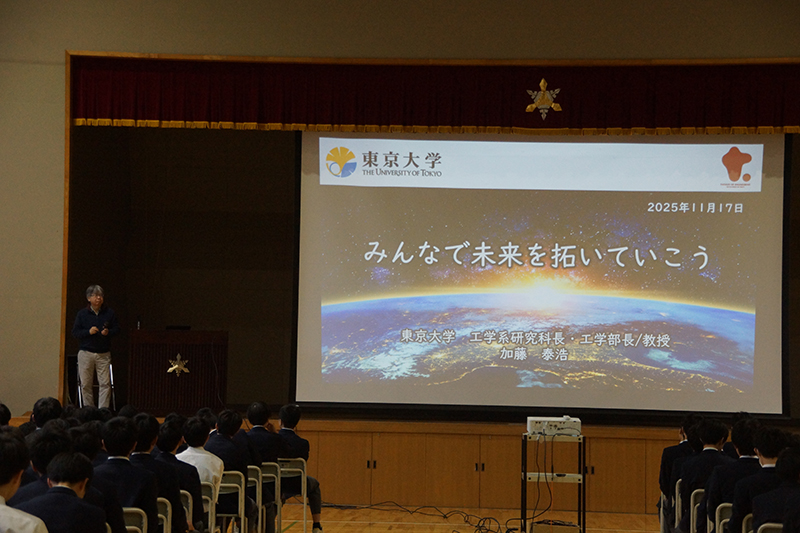 11月17日(月)、本校では3年連続となる、東京大学大学院工学系研究科長・工学部長の加藤泰浩教授による、中学生全員を対象とした特別講演会を実施しました。加藤教授からは、ご自身が取り組む海洋資源の研究に加えて、東京大学工学部で行われている世界トップレベルの多様な研究が紹介され、生徒たちは最先端の学問がどのように社会課題の解決につながっていくのかを具体的に知ることができました。また、工学が基礎科学の追究から社会実装、新しい融合領域の開拓まで広範な分野を包含していること、そして東京大学工学部がインクルーシブ社会の実現や男女共同参画の推進に取り組んでいることについても紹介され、「多様性を尊重し、一人ひとりが力を発揮できる社会をつくることが工学の役割である」との言葉が印象的でした。生徒からは「最先端研究を知り工学に興味が湧いた」「世界の課題と自分の将来がつながった」などの声が寄せられ、非常に有意義な時間となりました。