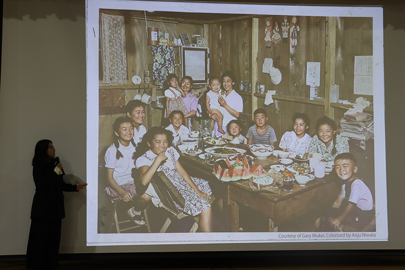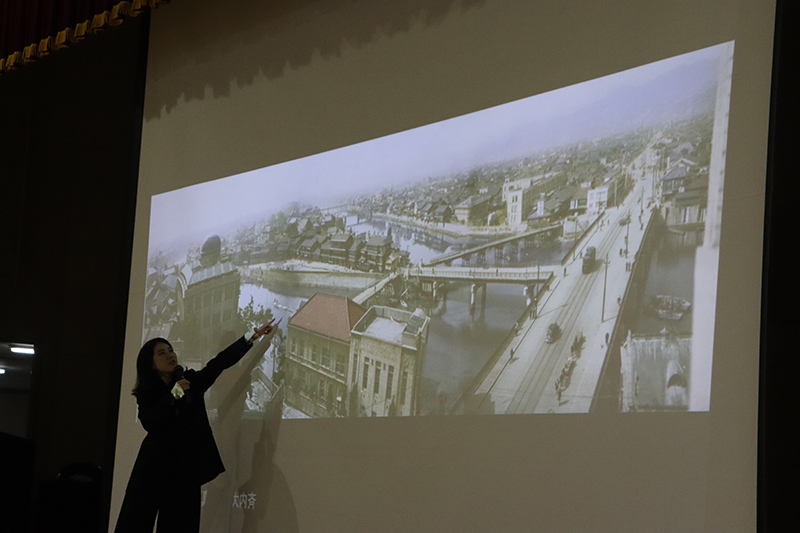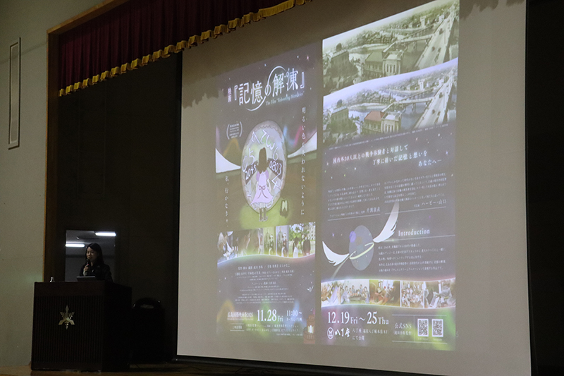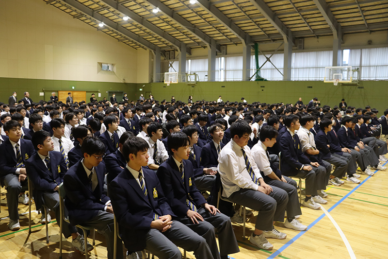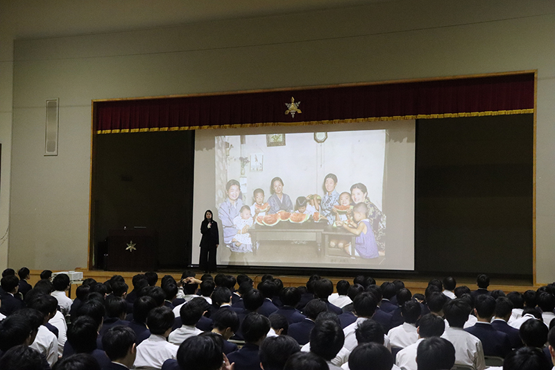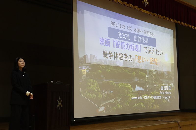 11月26日(水)の7時間目に、中学1年生から高校1年生までを対象とした進路講演会を行いました。今回は、広島テレビ放送株式会社の報道記者・ディレクターであり、「peace artist」としても活躍されている庭田杏珠(にわた あんじゅ)さんをお招きいたしました。庭田さんには、「記憶の解凍」-色を取り戻した写真が語る戦争と平和、というテーマで、戦前から戦後にかけての白黒写真に色をよみがえらせる際の制作の舞台裏や、当時を知る人々への対話・取材を通して見えてきた「平和を伝えることの意味」について、わかりやすくお話しいただきました。広島への原爆投下前の日常の写真に焦点を当ててご説明いただきましたが、白黒写真のカラー化においてAI技術で自動カラー化できるのは1割程度で、残りは写真提供者との対話、資料分析、SNSでの時代考証などを踏まえて手作業で補正する必要があるとのことでした。庭田さんが、戦争当時の記憶を持つ人たちの想いを大切にし、戦争の記憶を「自分ごと」としてとらえて多くの人に知ってもらいたいという強い思いをもって「記憶の解凍」に取り組まれていることが伝わってきました。また庭田さんからは、「戦争とは平和な日常を一瞬で壊してしまう恐ろしいものであり、被爆前には今の私たちと変わらない暮らしがあって、それがたった一発の原子爆弾で一瞬のうちに奪われたのだという事実を自分ごととしてとらえ、自分の得意な方法で大切な友人や家族に伝えていってもらえるとうれしいです」という、北嶺生へのメッセージもいただきました。さらに、著書『AIとカラー化した写真でよみがえる戦前・戦争』(共著、光文社新書)をご寄贈いただきました。また、庭田さんの「記憶の解凍」の取り組みを描いた映画が、12月19日~25日に広島の「八丁座」で上映される予定です。今年は終戦80周年を迎えます。当時の戦争体験者の「想い」や「記憶」を継承し、戦争や平和についてじっくり考える機会を大切にしていきたいものです。