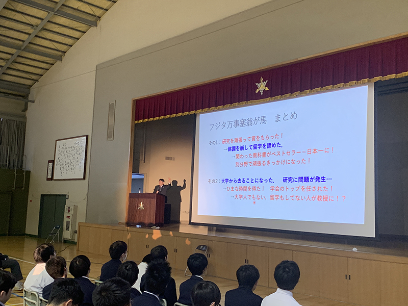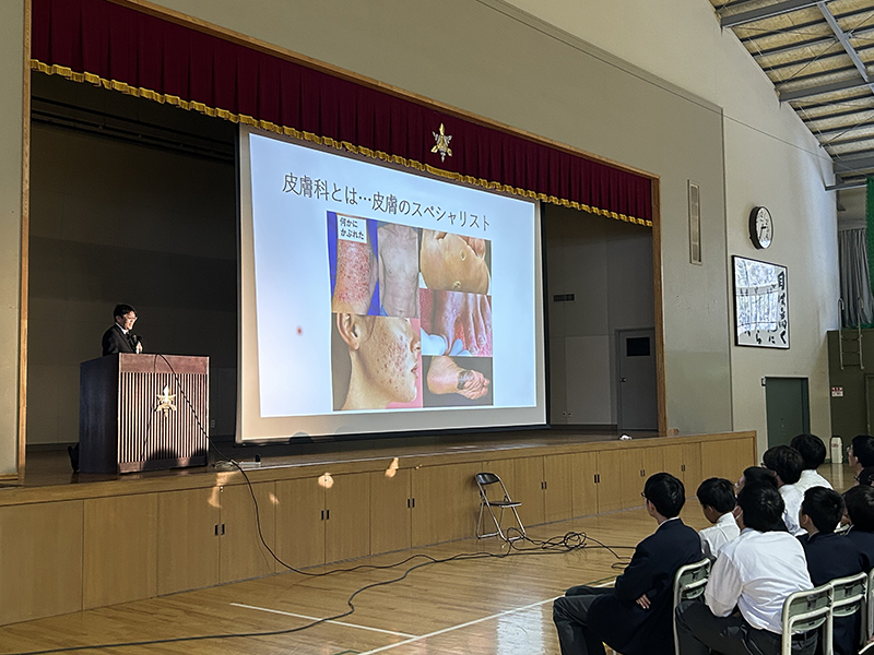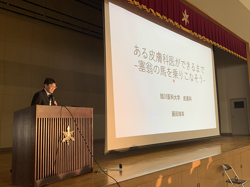 12月6日(土)、旭川医科大学皮膚科学講座 教授・科長の藤田靖幸先生をお迎えし、メディカルスクール講演会を実施しました。講演タイトルは「ある皮膚科医ができるまで ― 塞翁の馬を乗りこなそう ―」。学生時代のエピソードから、恋愛やお金の話、さらには皮膚科の専門的で興味深い話題まで、多岐にわたる内容を、ユーモアを交えながらわかりやすく語ってくださいました。皮膚科という分野が持つ幅広さや奥深さ、「塞翁が馬」の故事に重ねたキャリアの歩み方、そして医学を志すうえで大切にすべき姿勢など、実践的で心に響くメッセージが満載の時間となりました。生徒たちからは、「医師になる道のりを具体的にイメージできた」「皮膚科の印象が大きく変わった」といった声が多く寄せられ、進路選択に向けた大きな刺激となったようです。藤田先生、お忙しい中貴重なお話をありがとうございました。