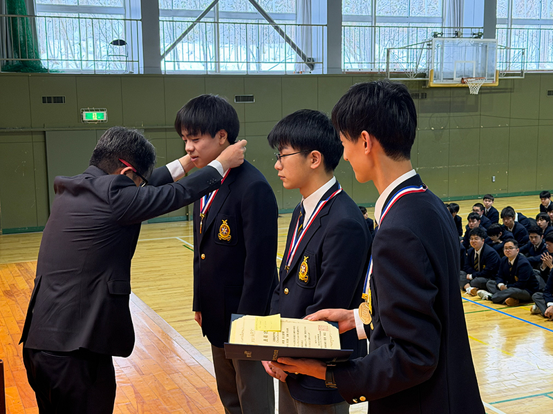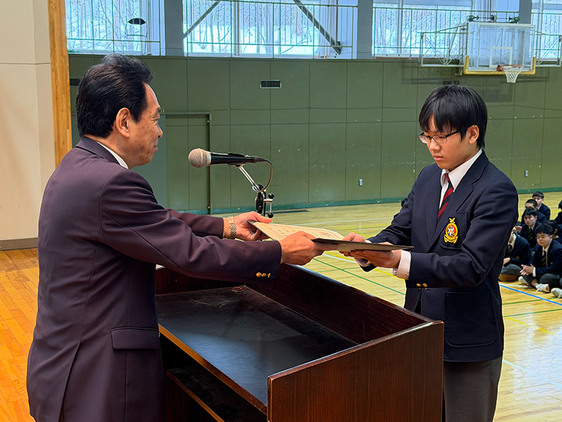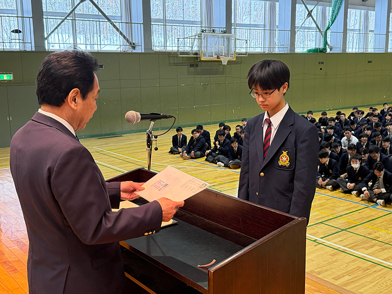 1月13日(火)、3学期始業式・各種表彰が行われました。始業式に先立ち、まずは各分野で顕著な成果を収めた生徒の表彰が行われました。高校1年の秋野丞太朗君、猿橋英治君、野田具宏君は、「第13回高校生ビジネスプラングランプリ」において、全国5,640件の応募の中から全国ベスト100に入賞しました。4月から進路探究の時間を通して、社会課題をビジネスの視点で解決するアントレプレナーシップを学び、その成果が評価され、日本政策金融公庫の方より直接表彰を受けました。また、中学2年の里一輝君は、国家資格である危険物取扱者甲種に合格しました。最難関とされる甲種は合格率約35%であり、中学生での合格は快挙です。さらに、中学3年の大堀賢吾君は、第34回日本クラシック音楽コンクール全国大会ヴァイオリン部門・中学校の部で第3位に入賞しました。