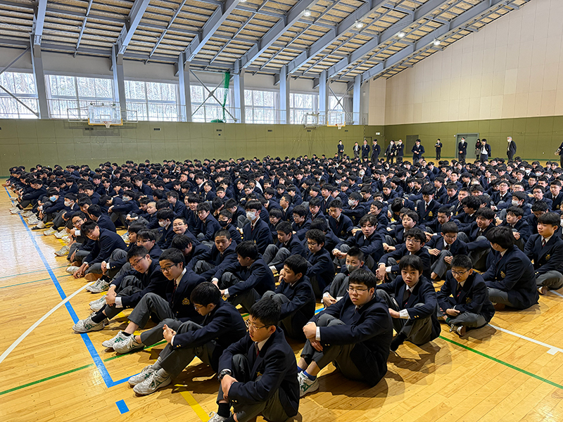 始業式では、谷地田校長から、表彰を受けた生徒をはじめとする北嶺生の活躍を称える言葉がありました。また、3学期には、東京大学から金融庁に進まれた中里祐太さん(23期)や、京都大学卒業後に落語家として活躍されている春風亭いっ休さん(永井智理さん21期)による講演会が予定されていることが紹介されました。高校3年生は今週末に控える大学入学共通テストに向けて懸命に努力しており、その健闘を激励するとともに、1月8日に北嶺中学入学試験が実施され、春には新41期生を迎えることにも触れられました。最後に、生徒一人ひとりが自らを律し、実り多い3学期を過ごしてほしいとのメッセージが送られました。北嶺生の2026年が素晴らしいものとなるよう期待しています。