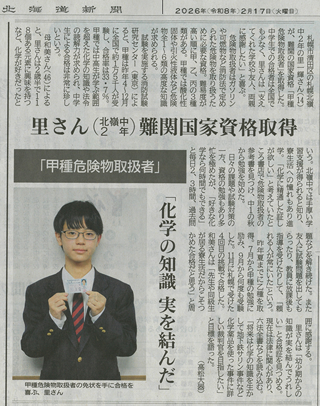 本校中学2年の里一輝さんが、難関の国家資格「甲種危険物取扱者」を取得しました。甲種危険物取扱者は、危険物全類を取り扱うことができる高度な資格であり、中学生での合格は全国的にも非常にまれです。 里さんは「支えてくれた学校の先生方や友人、そして両親に感謝しています」と喜びを語っています。 この快挙は、北海道新聞でも大きく取り上げられました。ぜひご覧ください。 北海道新聞社許諾D2602-2702-00030994