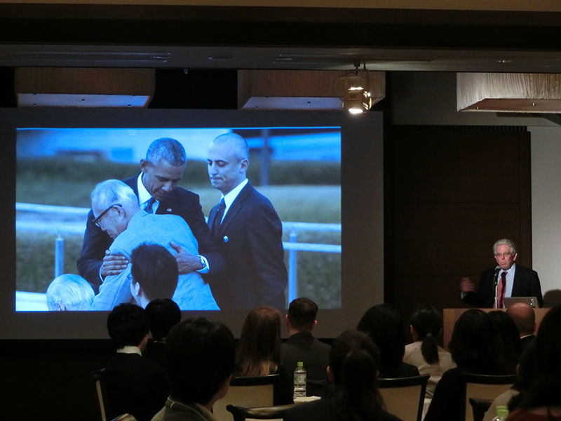今年は前ボストン米日協会の理事長のPeter Grilli氏が「被爆米兵の足跡をたどって」というタイトルで講演をされたのち、参加者たちは「日米関係の過去・現在・未来」についてグループディスカッションをしました。参加生徒の2人は、各グループのモデレーター(まとめ役)を立派に務め、全体会では討論内容や自らの考えを英語で発表しました。